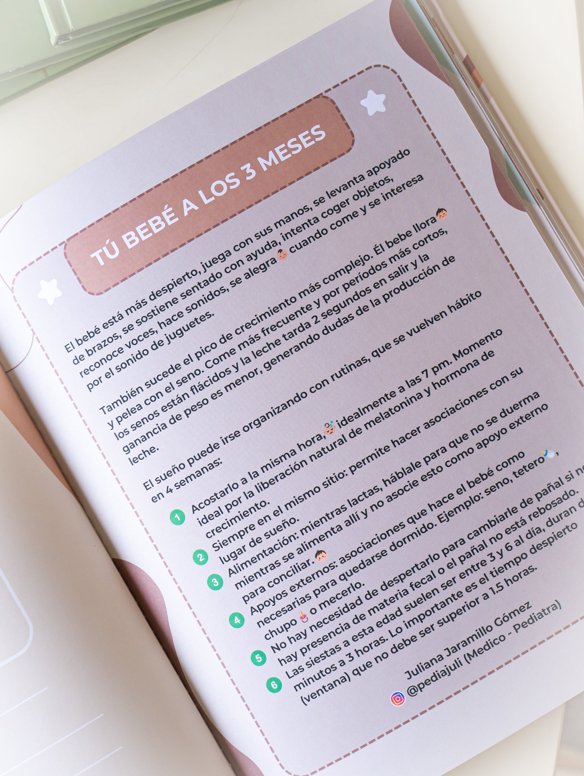 Finalmente encontrarán mes a mes unos tips prácticos escritos por pediatras para cada etapa del bebé como Su desarrollo , cuidados, estimulación entre otros.